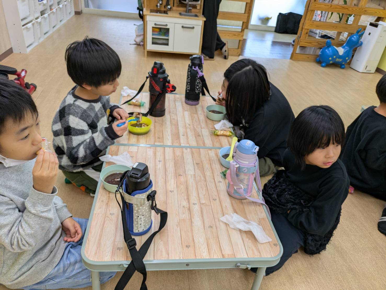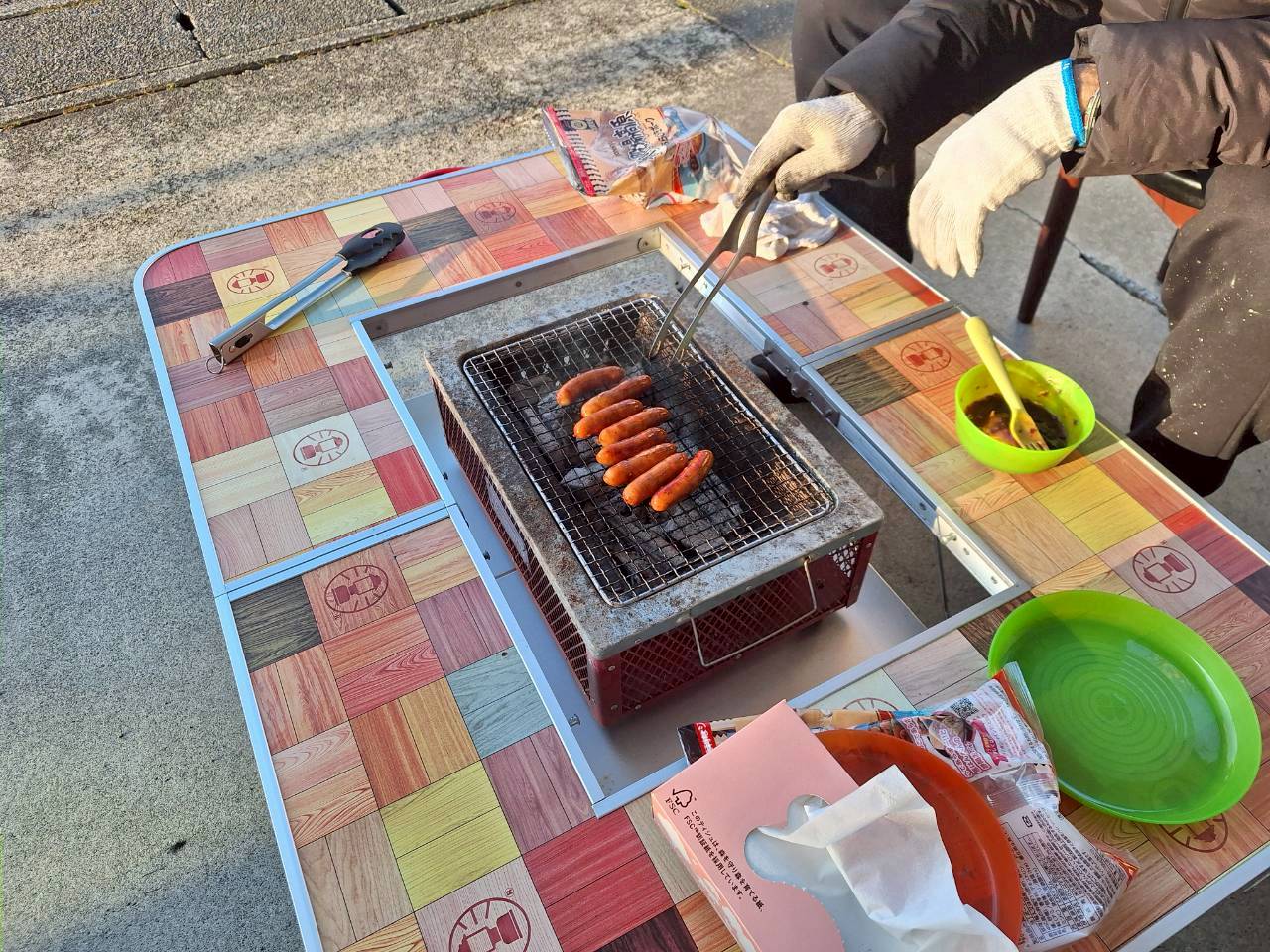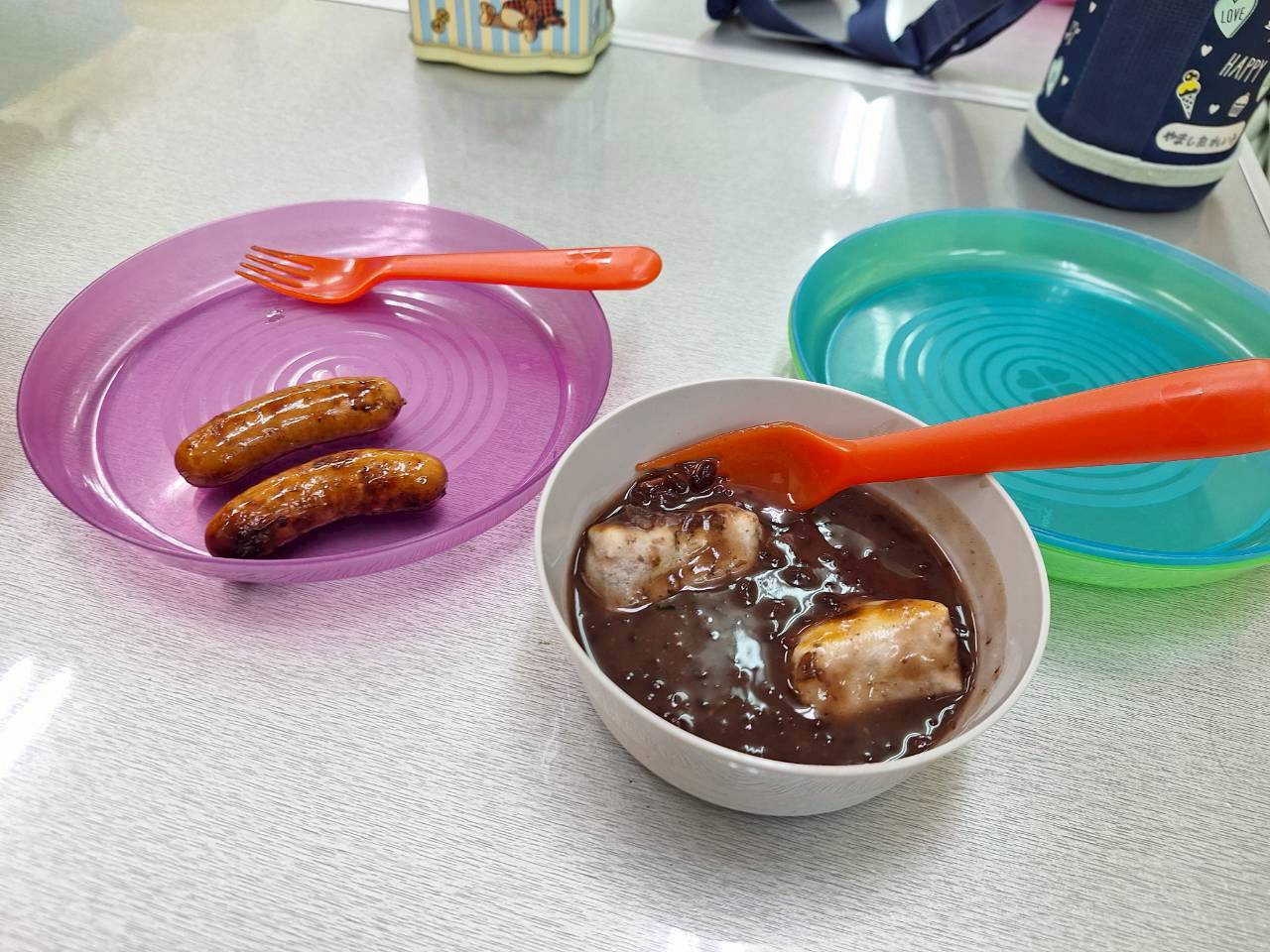 午後は体育館で運動してから、「お汁粉」や「炭火焼きウインナー」を おやつに頂きました。