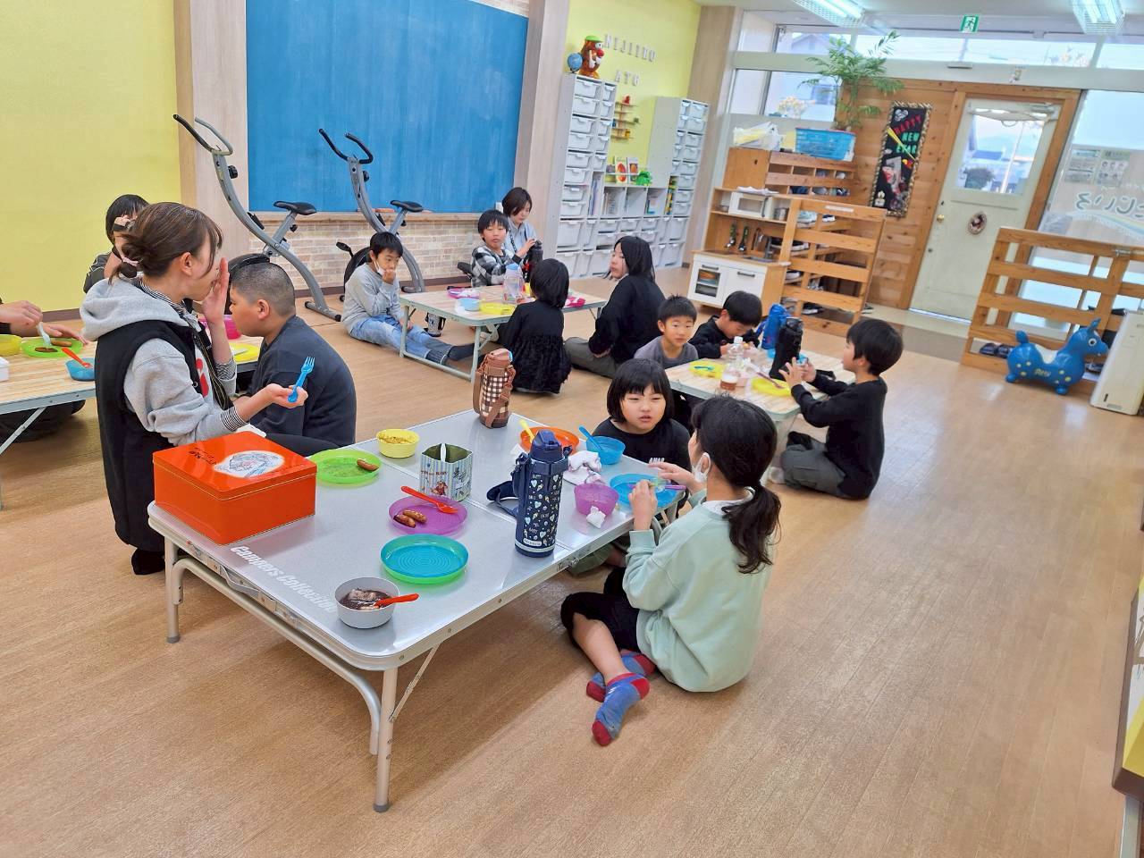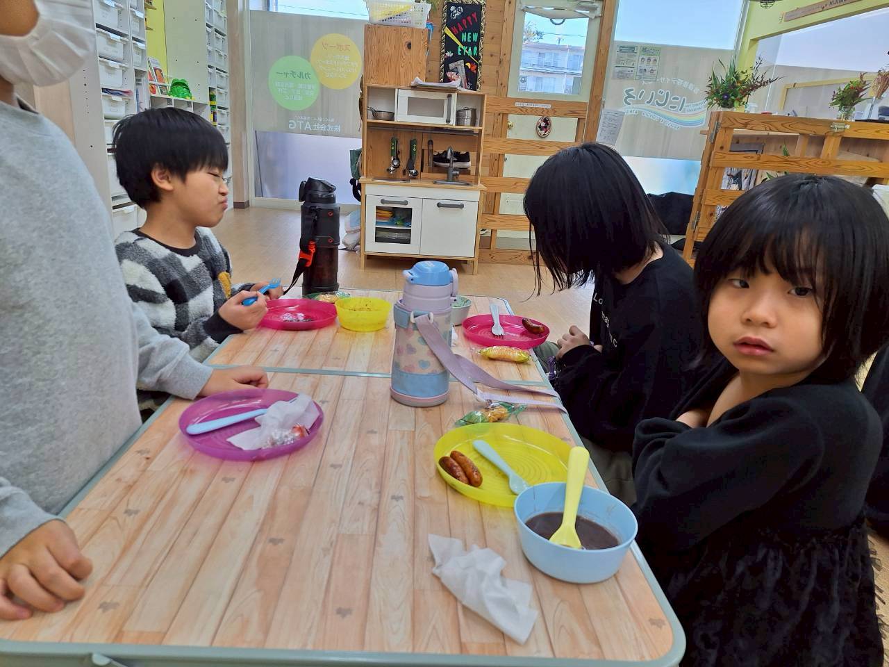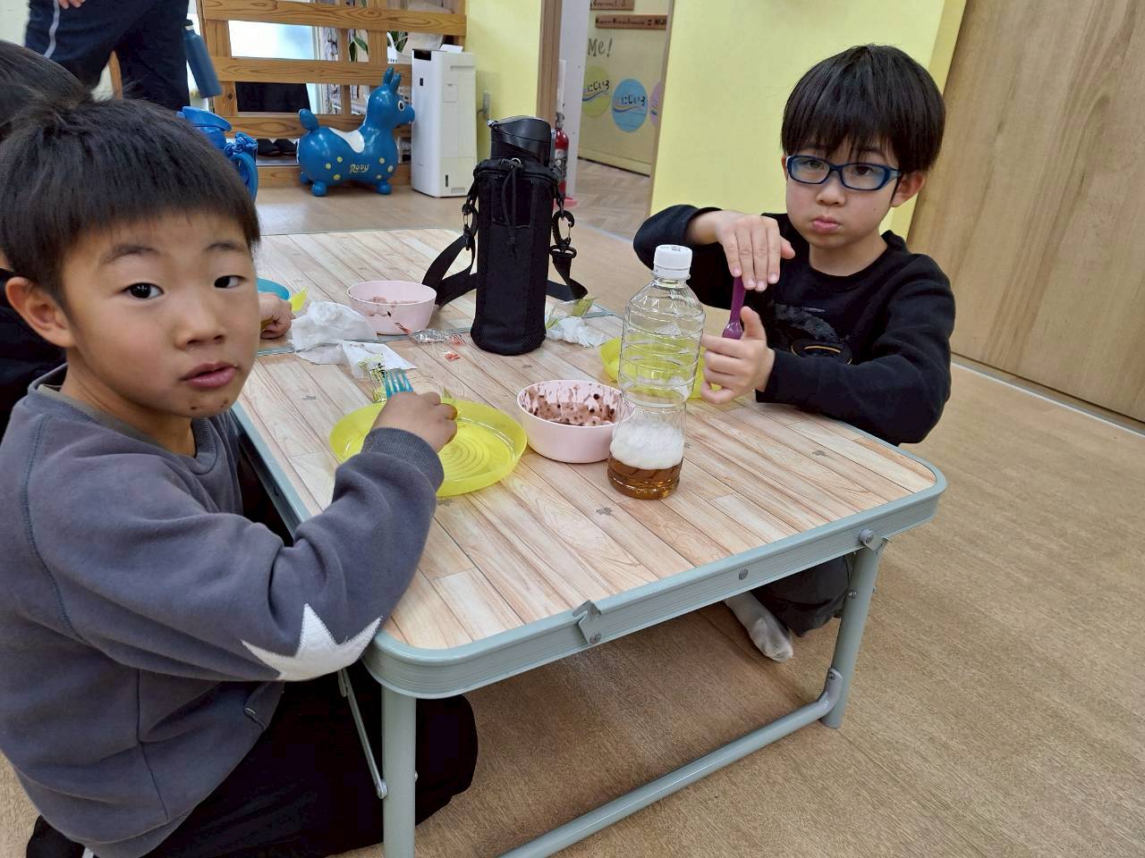 午後は体育館で運動してから、「お汁粉」や「炭火焼きウインナー」を おやつに頂きました。