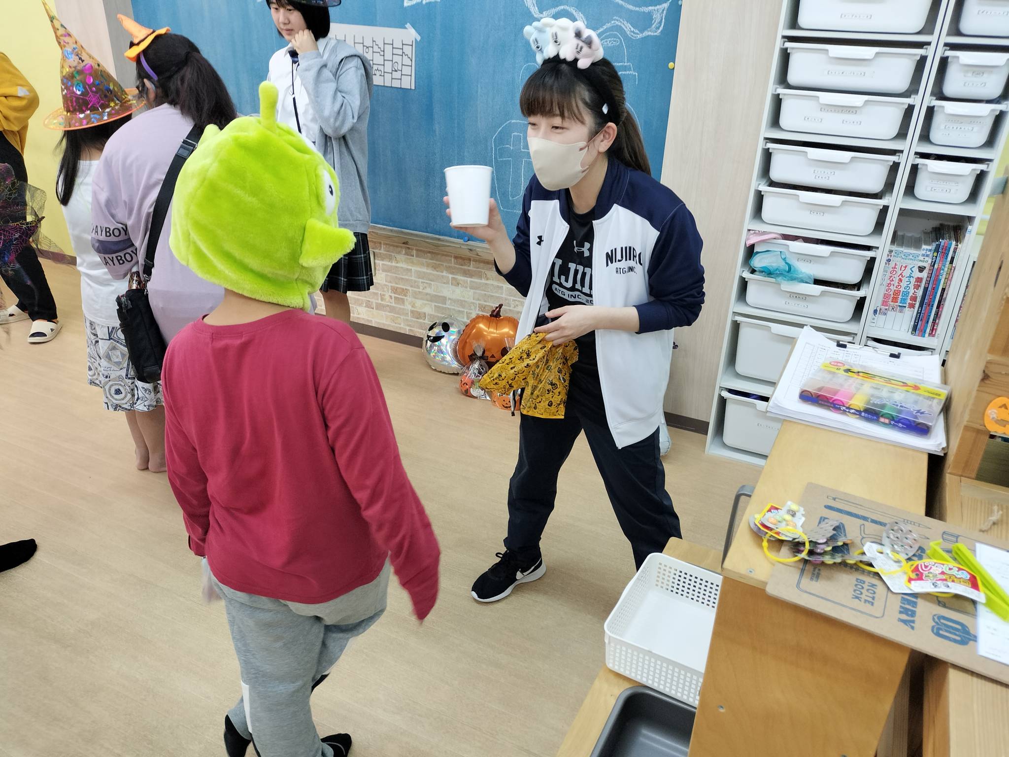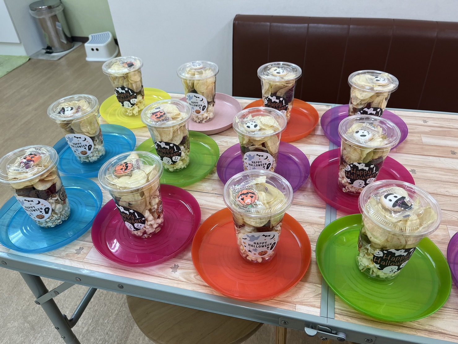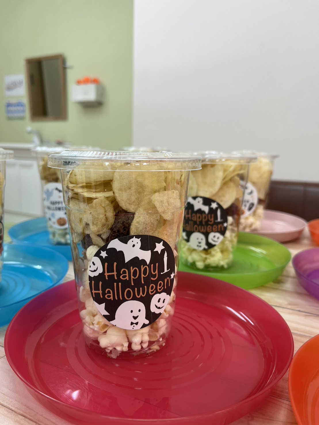 🌈にじいろ もハロウィン🎃デイ2日目となりました。今日は、おやつが「ハロウィン🎃おやつ」でした。クリアカップに可愛くお菓子が詰まっています🥰