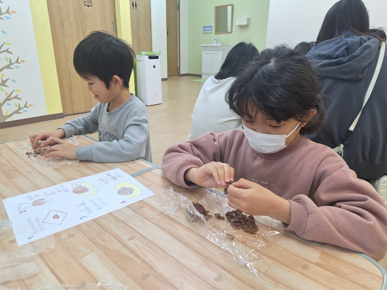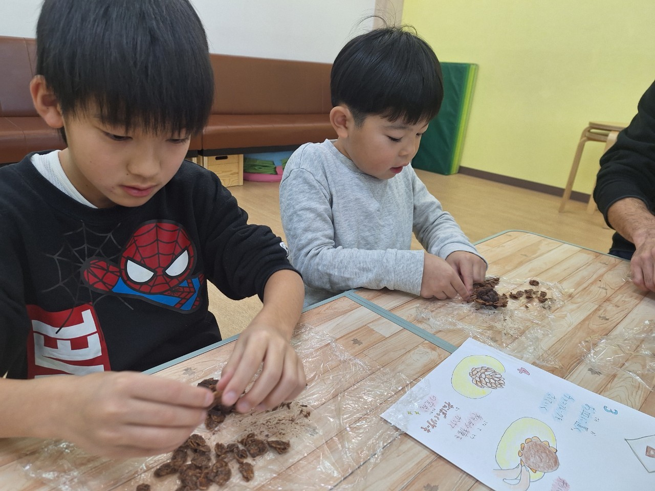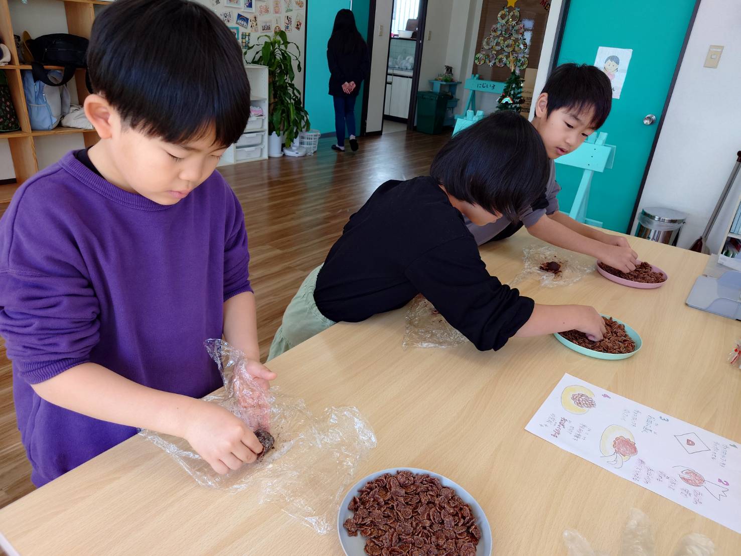 今週はクリスマスウィーク🎅なので、おやつに「松ぼっくりケーキ」を作りました。ロールケーキを潰して丸め、その土台にチョコフレークを刺して、松ぼっくりの形を形成していきました!