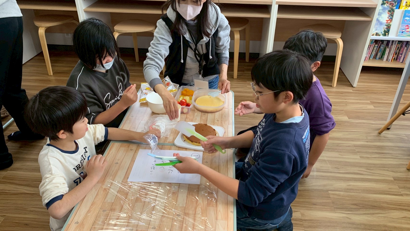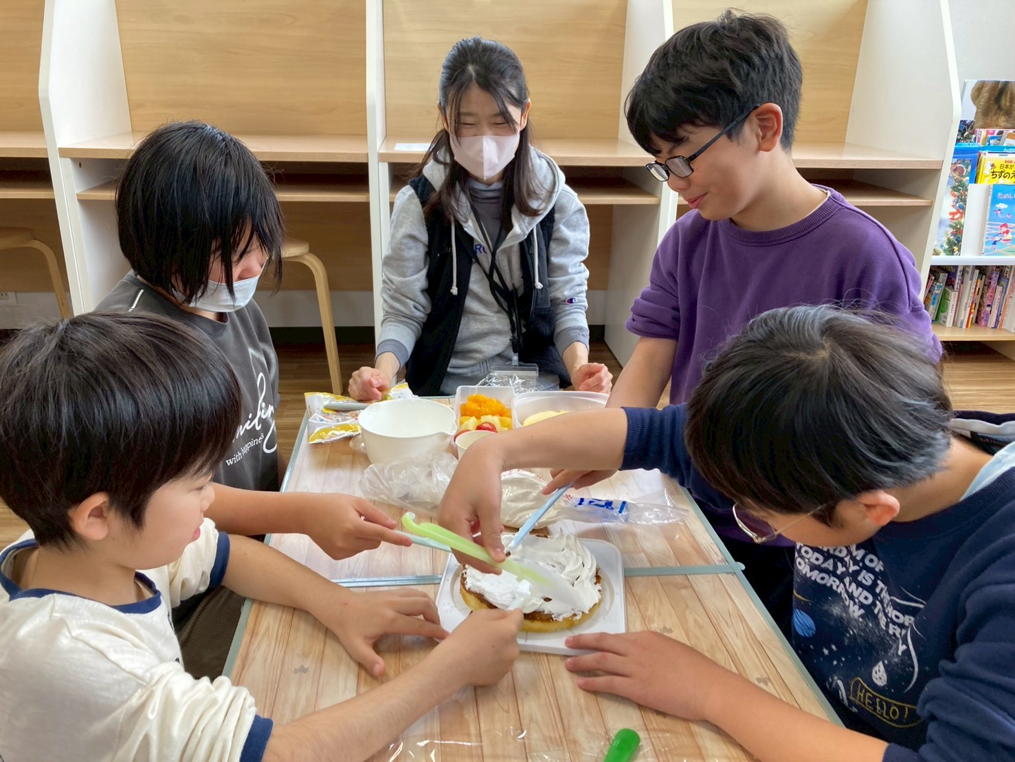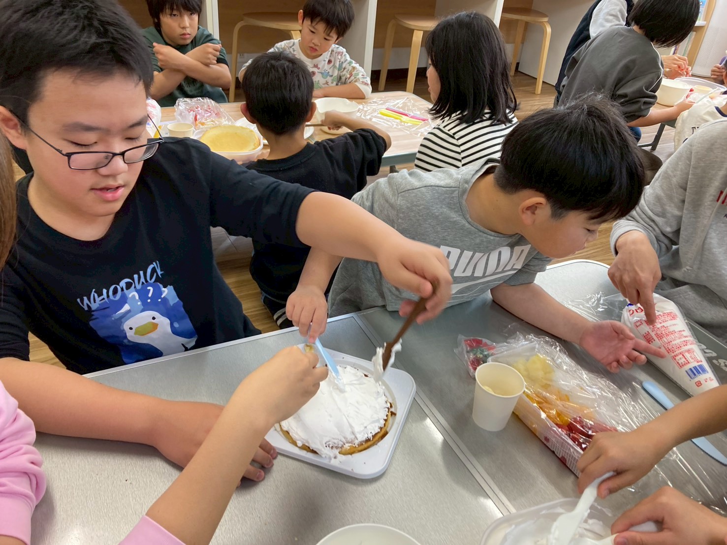 5〜6人のグループに別れてスポンジにクリームを塗りフルーツをトッピングしていきます。グループ事に知恵を出し合い素敵なクリスマスケーキ🎅🎂を作りあげました✨