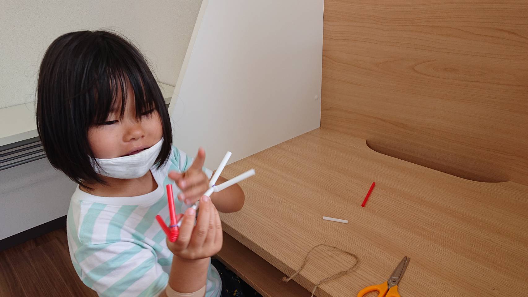 ストローの中に紐や輪ゴムを通して作っていきました。細かい作業でしたが、たのしみながらの手先の訓練になりました😄👍